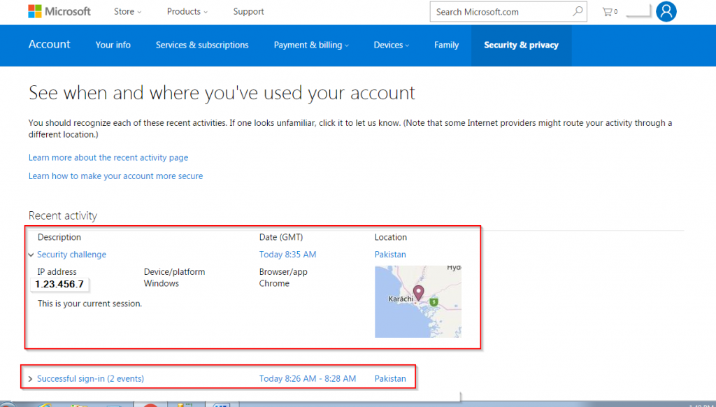 Step 3: On appearing window, Click “See my recent activity”. You will be prompted to verify your account by giving your verification email/phone number that was given at the time of account creating. Give your email/phone number and you will receive a code from Microsoft to access your “recent activity” page.